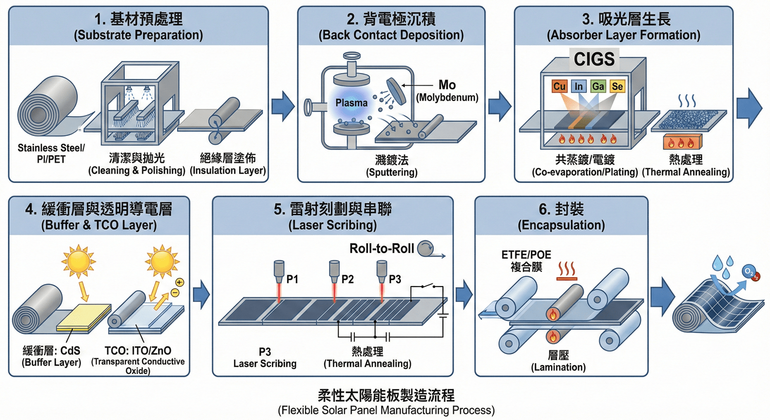 柔性太陽能板是以薄膜型太陽能電池(Thin-Film Solar Cell)為基礎,將發電層製作在可彎曲基材(Plastic / Metal Foil)上,使其具備可彎曲、輕量化、可貼附於曲面等特性。柔性太陽能板通常採用Roll-to-Roll 製程,與塗佈設備高度相關。